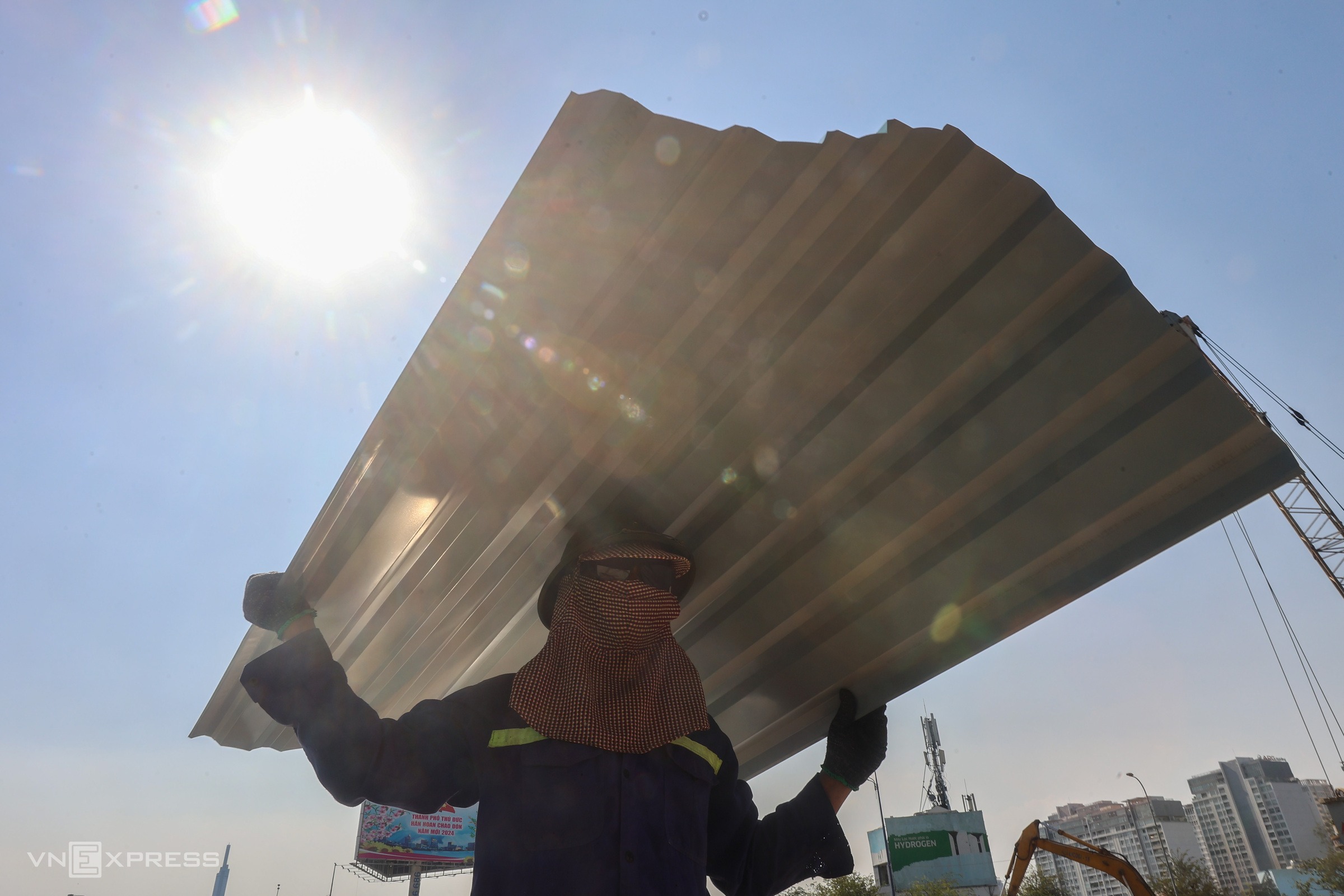 A construction worker braving the intense heat in Ho Chi Minh City on April 9, 2024, as the temperature climbed above 40 degrees Celsius. Photo by VnExpress/Quynh Tran