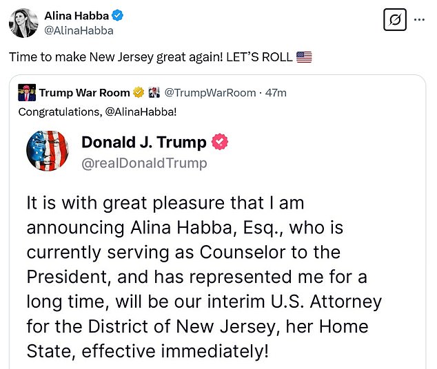 ‘I am honored to serve my home state of New Jersey as Interim U.S. Attorney and I am grateful to President Trump for entrusting me with this tremendous responsibility,’ Habba wrote on X. ‘Just like I did during my time as President Trump’s personal attorney, I will continue to fight for truth and justice.’
