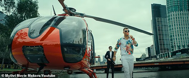 , shows up towards the conclusion of the footage appearing fierce as he steps out of a red helicopter in a sequence filmed in Melbourne — and oddly enough, enjoys a big lollipop.