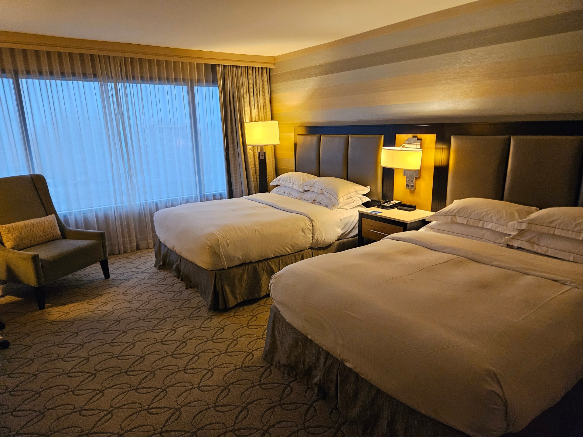 The Hilton met all of our requirements exactly. Our deluxe double queen room (priced from around $412 CAD / £224) offered an amazing view, and the hotel featured two swimming pools, a fitness center, and a beautifully designed bar and dining area, which helped us feel better after landing tired and famished.