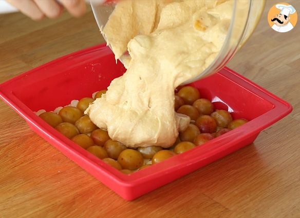 Rinse the mirabelles, cut them in half, and take out the seeds. Gently mix the fruit into the batter with a spatula. Then pour this mixture evenly over the mirabelles inside the dish.