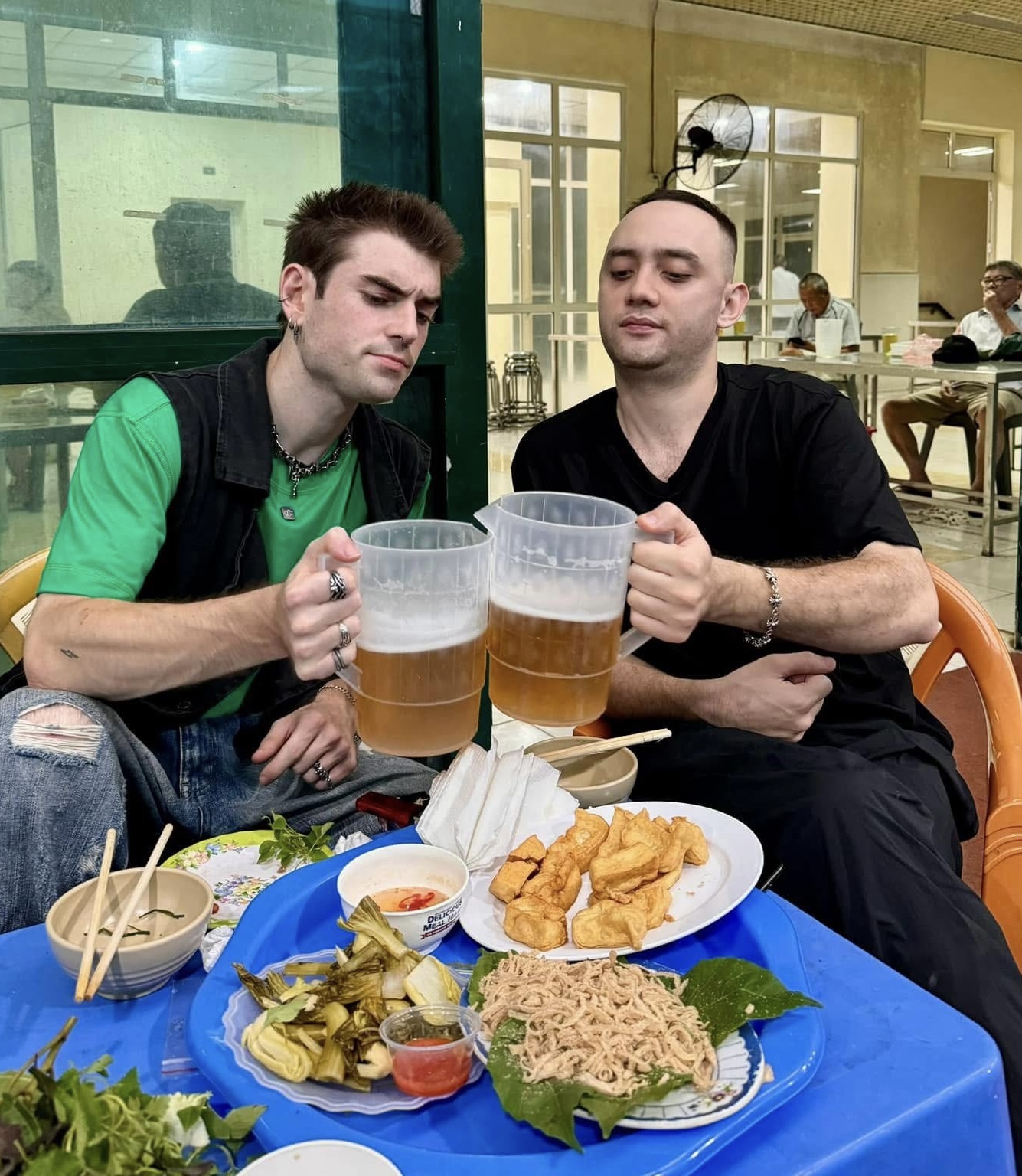 Maximilian Rolf (L) sips on beer and savors local cuisine with a companion in Hanoi. Image provided by Maximilian Rolf
