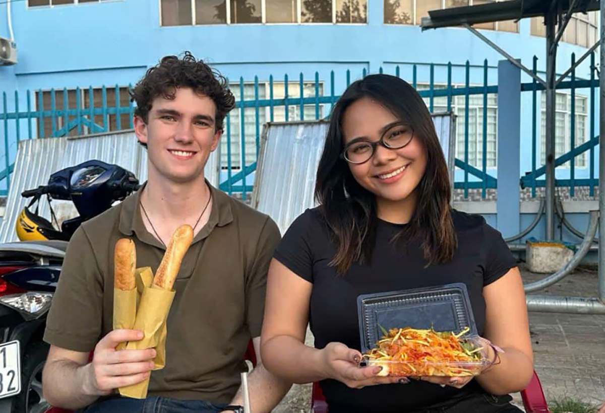 Zane Hanson (L) and his Vietnamese partner sample local street food in Ho Chi Minh City. Photo courtesy of Zane Hanson