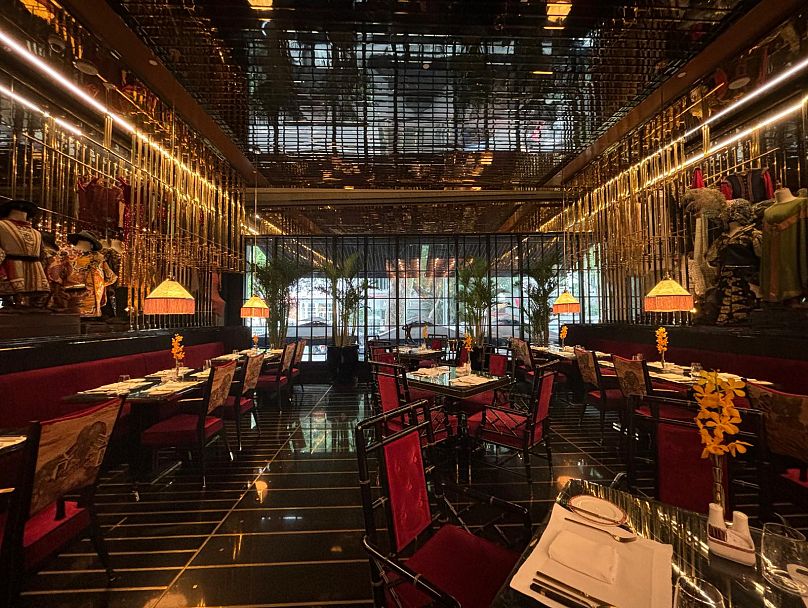 The ground-floor Michelin-acclaimed restaurant is called Backstage, where the luxurious crimson velvet seats, full-length curtains, and glittering outfits adorning the walls beautifully capture the essence of backstage activity.